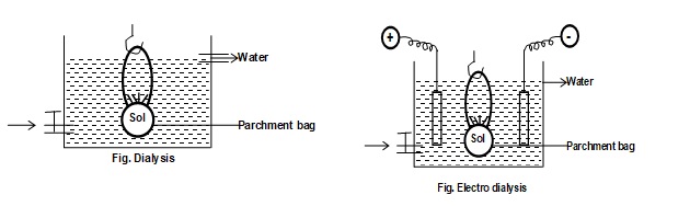 Electro-dialysis: The ordinary process of dialysis is slow. To increase the process of purification, the dialysis is carried out by applying electric field. This process is called electro-dialysis.
