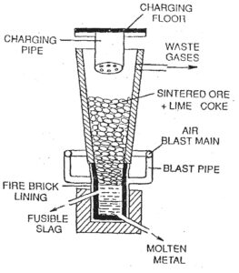 The carbon reduction process is usually carried out in a blast furnace. The tall cylindrical blast furnace is made of steel plates and lined inside with heat resisting bricks. The mouth of the furnace is provided with an inlet for the introduction of charge and an outlet for the waste gases. Slag and the ‘molten metal are removed from the base of the tower, It is also provided with tuyers arrangement for the introduction of a hot blast of air. The exact size of the blast furnace depends upon the nature of the ore used.