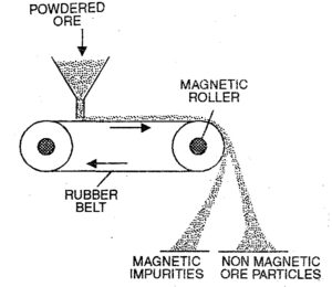 This method is meant for concentrating such ores which differ from their impurities in magnetic character, For example, the main impurity in tin stone (SnO2) is ferrous tungstate (FeWO4) called wolfram. Here tin stone is diamagnetic in behaviour. The powdered ore is dropped over a belt revolving round the two rollers, one of the rollers being a magnet. The magnetic part of the ore is attracted by the magnetic roller and forms a heap near it, whereas the non-magnetic part of the ore forms a separate heap a little away from the magnetic impurities.