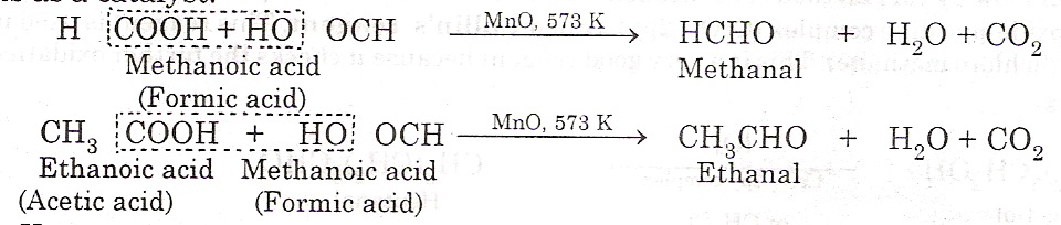 3) From carboxylic acids: Aldehydes can be prepared by catalytic decomposition of carboxylic acid. This can be done by heating a mixture of methanoic acid or other acids to 300ºc in the presence of MnO2 which acts as catalyst.