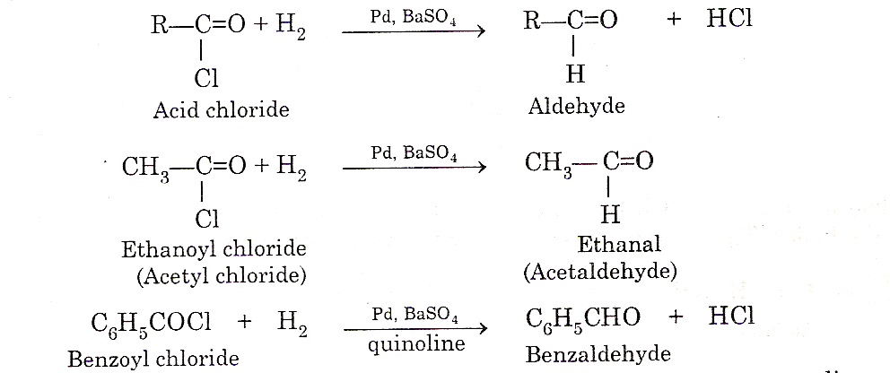 4) From acid chlorides: Aldehyde can be prepared by catalytic hydrogenation in the presence of palladium (Pd) catalyst supported over barium sulphate. The catalytic mixture is poisoned by the addition of a small quantity of suphur or quinoline. This reaction is called Rosenmund reduction.