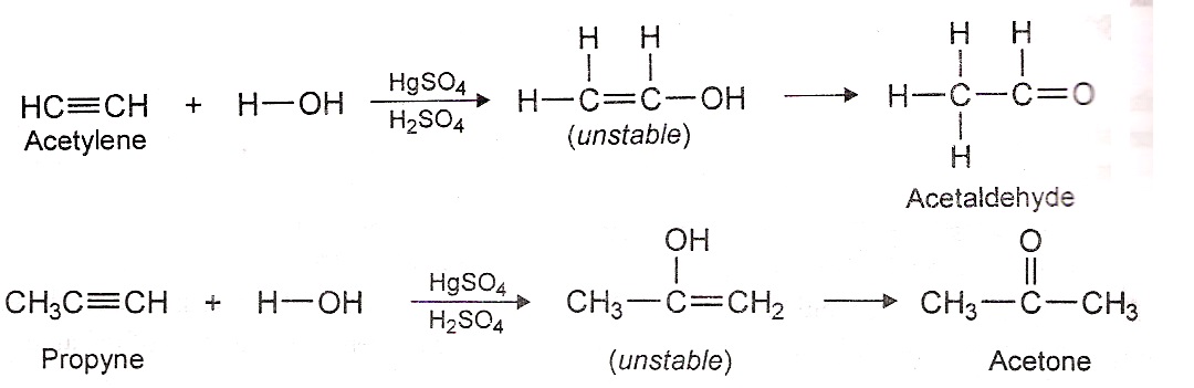 5) FromAlkynes: Aldehydes and ketones can be prepared by hydration of alkynes in presence of dil. H2SO4 and HgSO4 as catalyst. Water adds to alkynes to form an unstable enol intermediates which rearrange to form aldehydes or ketones.