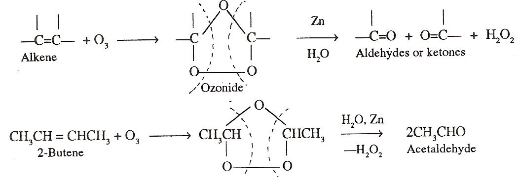 6) From Alkenes: Aldehydes and ketones can be prepared by the ozonolysis of alkenes. This involves the treatment of the alkenes with ozone to give ozonides. The ozonides are not isolated because they are often explosive in dry state. They are decomposed with Zn+H2O to form aldehydes and ketones.