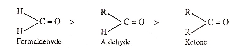 Relative reactivity of aldehydes and ketones: In general, ketones are less reactive than aldehydes. This is due to the following reasons: