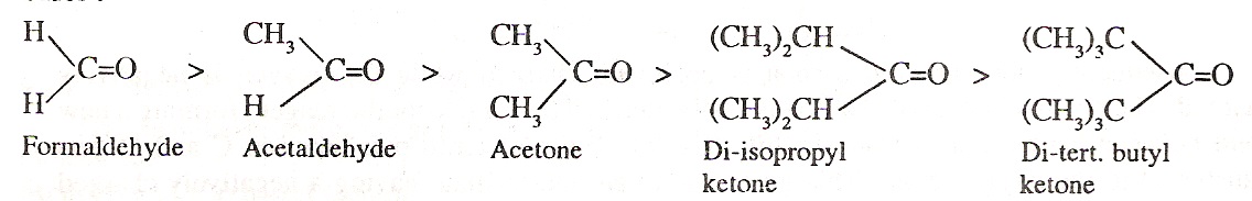 2) Stearic effect: The size of the alkyl group is more than that of hydrogen. In aldehydes, there is one alkyl group but in ketones, there are two alkyl groups attached to the carbonyl group. This is called stearic hindrance. As the number and size of the alkyl groups increase, the hindrance to the attack of nucleophile also increases and reactivity decreases. The lack of hindrance in nucleophilic attack is another reason for the greater reactivity of formaldehyde. Thus, the reactivity follows the order:
