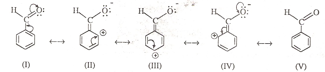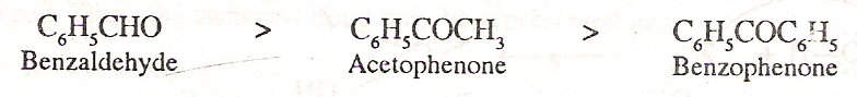 It is clear from the resonating structures that due to electron releasing (+I effect) of the benzene ring, the magnitude of the positive charge on the carbonyl group decreases and consequently it becomes less susceptible to the nucleophilic attack. Thus, aromatic aldehydes and ketones are less reactive than the corresponding aliphatic aldehydes and ketones. The order of reactivity of aromatic aldehydes and ketones is: