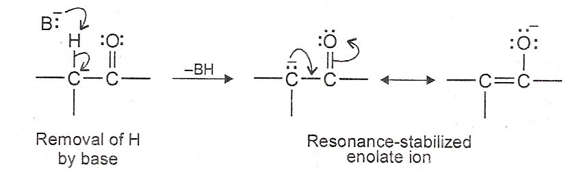 Acidity of α-hydrogen: A carbon atom next to the carbonyl group is called an α-carbon. A hydrogen attached to an α-carbon is referred to as an α-hydrogen. The α-hydrogen of aldehydes and ketones are acidic in nature. The acidity is due to the fact that the anion, which results from the removal of an α-hydrogen by a base B:–, is stabilized by resonance. The resonance-stabilized anion is called Enolate Ion.