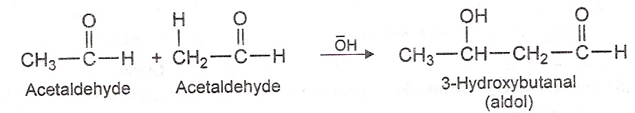 1) Aldol condensation: Aldehydes containing α-hydrogens undergo self addition reaction in the presence of a base to form products called Aldols. The reaction is called Aldol condensation. For example, when two molecules of acetaldehyde combine with each other in the presence of dilute solution of NaOH to form 3-hydroxybutanal (aldol).