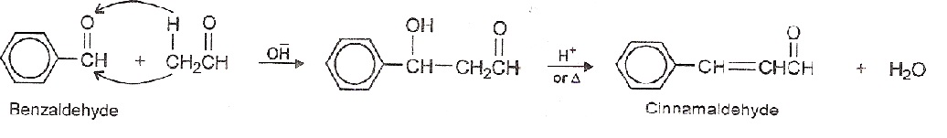 2) Cross aldol condensation: The reaction of two different carbonyl compounds (one of which must have an α-hydrogen) in the presence of a base is known as cross or mixed aldol condensation. For examples, acetaldehyde reacts with benzaldehyde which lack of α-hydrogen in presence of a base to form cinnamaldehyde.