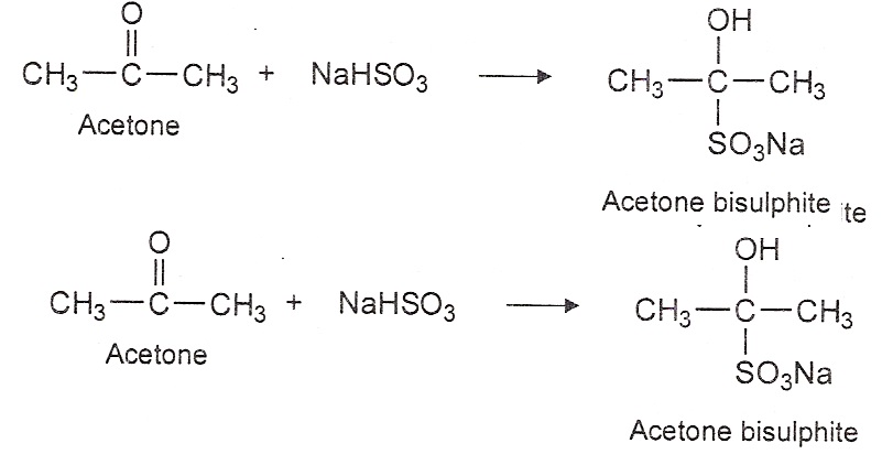 1) Addition of bisulphate: Aldehydes and ketones react with a saturated solution of sodium bisulphate (NaHSO3) to form an addition compound.