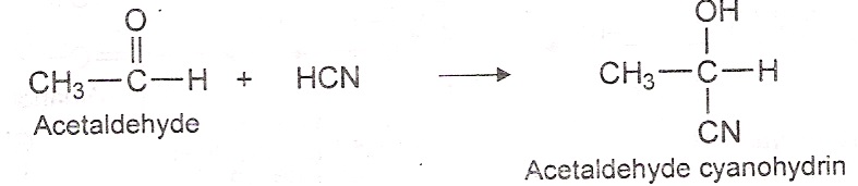 2) Addition of hydrogen cyanide: Aldehydes and ketones react with HCN in the presence of a acid catalyst to form cyanohydrin.