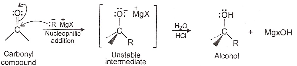 3) Addition of Grignard reagents: Aldehydes and ketones react with Grignard reagents to give an addition product which on acid hydrolyzed to give an alcohol.