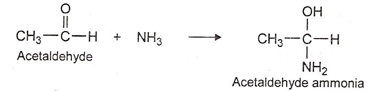 4) Addition of ammonia: Aldehydes (except formaldehyde) reacts with ammonia to form solid aldehyde ammonias.
