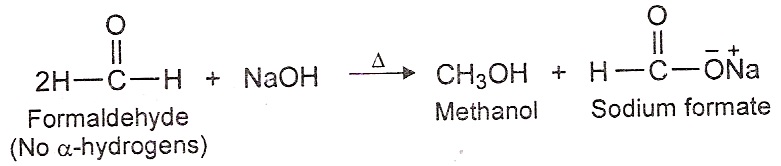 6) Cannizzaro’s Reaction: Aldehydes which lack an α-hydrogen, when heated with conc. NaOH, undergo a disproportionate reaction. One half of the aldehyde molecules are oxidized to a carboxylic acid and one half is reduced to an alcohol. This reaction is known as cannizzar’s reaction. e.g.