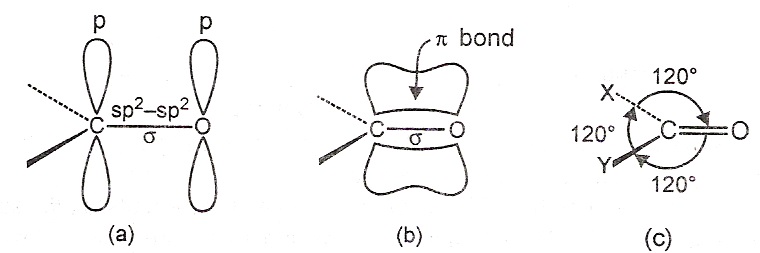 Both the carbon and oxygen are sp2 hybridized. The σ bond is formed by the overlap of an sp2 orbital of carbon and an sp2 orbital of oxygen. The π bond is formed by the overlap of unhybridised p-orbitals of two atoms. The two unshared electron pairs of oxygen occupy the sp2 hybrid orbitals of oxygen. Because the carbonyl carbon is sp2 hybridized, the three atoms attached to it lie in the same plane. The bond angles between the attached atoms are approximately 120º.