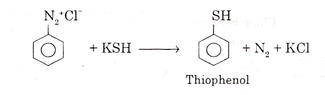 8) Reaction with potassium hydrosulphide: When diazonium chloride is treated with potassium hydrosulphide, thiophenol is produced.