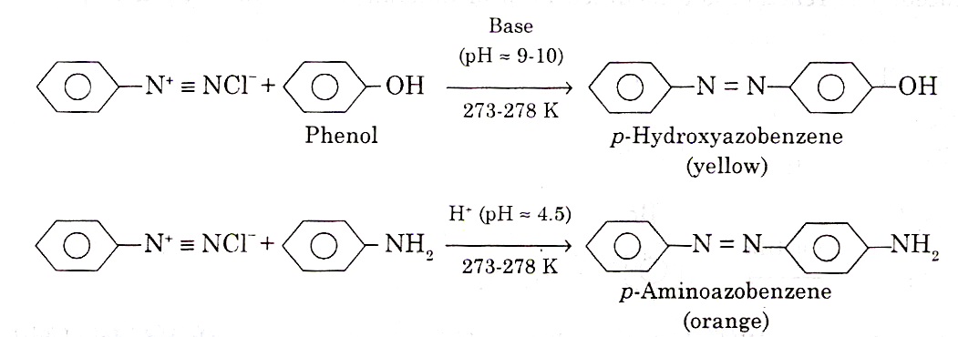 9) Coupling reaction: Benzene dioazonium chloride couples with electron rich aromatic compounds like phenols and aniline to give azo compounds. The azo compounds contain –N=N- bond and the reaction is called coupling reaction.