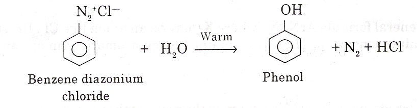 1) Reaction with water: When an aqueous solution of diazonium chloride is boiled with water, it gives phenols.
