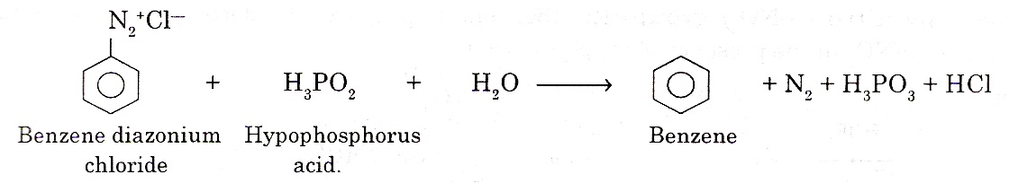 2) Reaction with hypophosphorus acid: When diazonium chloride is treated with hypophosphorus acid, benzene is formed.