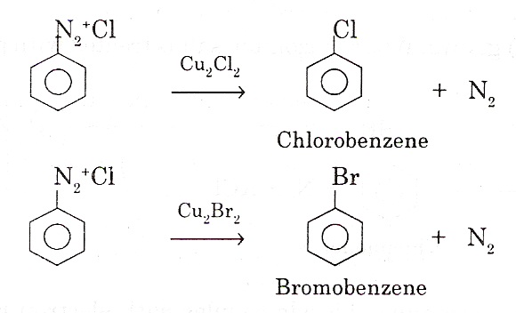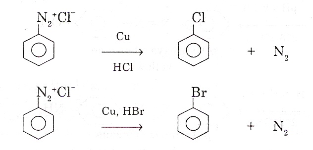 3) Reaction with cuprous chloride or cuprous bromide: When diazonium chloride solution is warmed with cuprous chloride or cuprous bromide the corresponding halide is formed.This reaction is called Sandmeyer reaction. When the diazonium chloride is warmed with copper powder and the corresponding halogen acid, the respective halogen is introduced. The reaction is a modified form of Sandmeyer reaction and is known as Gattermann reaction.