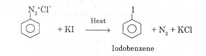 4) Reaction with KI: When aqueous solution of diazonium chloride is warmed with excess of potassium iodide, aryl iodide is formed.