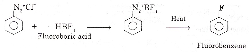 5) Reaction with fluoroboric acid: When diazonium chloride is treated with fluoroboric acid (HBF4), the flurorobenzene is formed. This reaction is called Schiemann reaction.