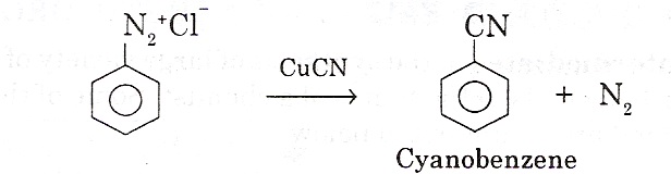 6) Reaction with copper cyanide: When diazonium chloride is treated with copper cyanide, cyanobenzene is formed.