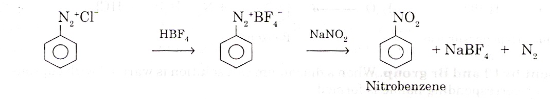 7) Replacement by Nitro group: Nitrobenzene is prepared by decomposing diazonium fluoroborate with aqueous NaNO2 in the presence of copper powder.