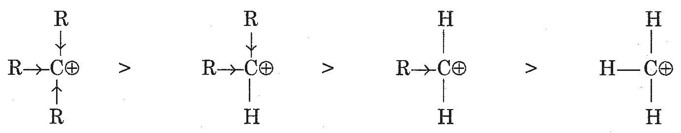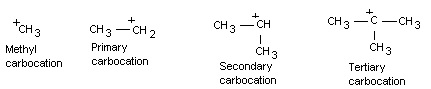 The carbocations are classified as primary (1°), secondary (2°) or tertiary (3°) depending upon whether one, two or three alkyl groups are attached to carbon bearing the positive charge as: