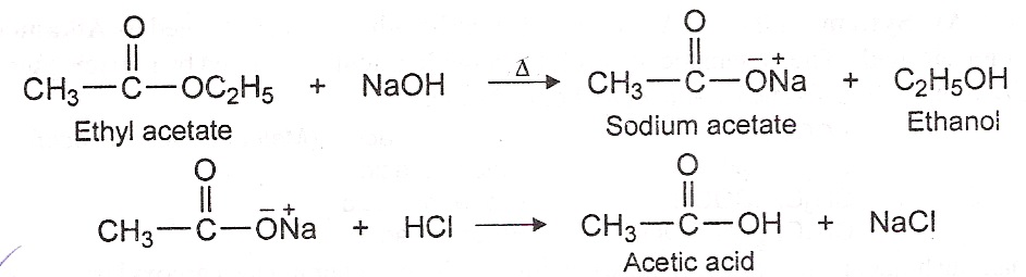 2) Hydrolysis of esters: When an ester is boiled with conc. solution of NaOH, sodium salt of the acid is formed which on treatment with dilute HCl gives carboxylic acid. e.g.