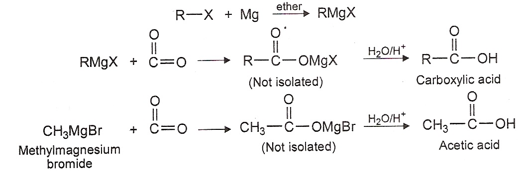 3) From Grignard reagent: Grignard reagents (RMgX) react with carbon dioxide to form addition products that can be hydrolysed to carboxylic acids.