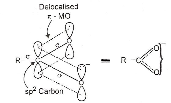 The stability of carboxylate ion can also be explained on the basis of its molecular orbital structure. The carbon atom of carboxylate ion is sp2-hybridised. It is bound to each oxygen atom by σ-bond. The unused carbon p-orbital overlaps with p-orbitals of both oxygen atoms to form stable delocalized molecular orbital as shown below.