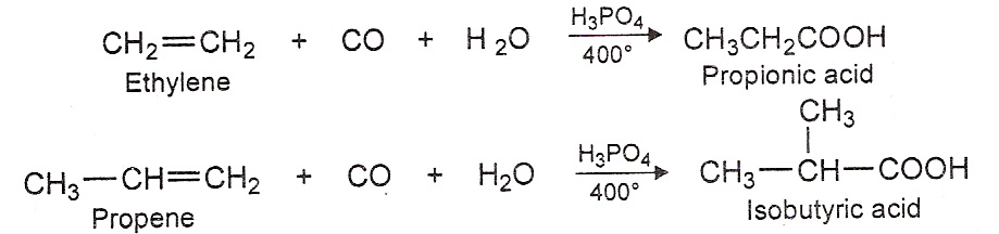 4) Carboxylation of alkene: When an alkene is heated with CO and steam under pressure in presence of phosphoric acid at 400ºC, carboxylic are formed (Koch reaction).