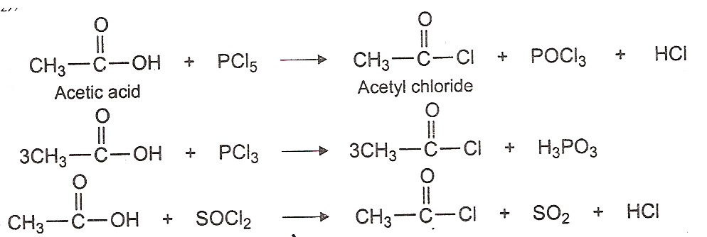 2) Formation of acid halides: Carboxylic acid reacts with phosphorus halides or thionyl chloride (SOCl2), to form acid halides. For example,