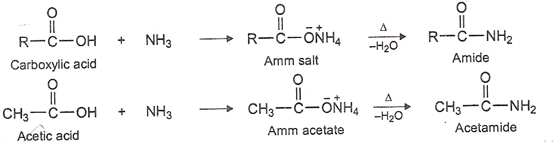 3) Formation of amides: Carboxylic acids react with ammonia give salts, which on heating yield amides.