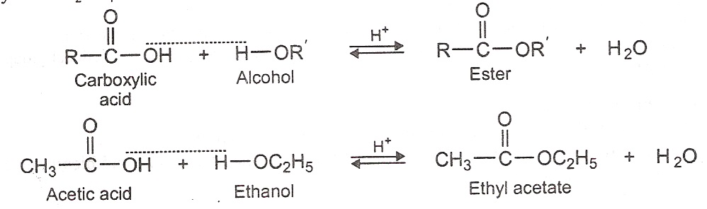4) Formation of esters: Carboxylic acid reacts with alcohols in presence of a strong acid catalyst like H2SO4 or HCl to form esters. The reaction is reversible and is called esterification.