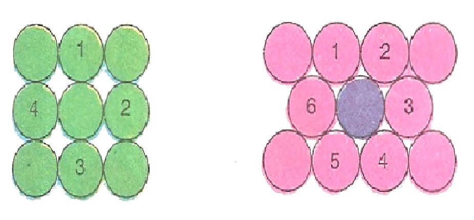 It can be seen that in arrangement (I), each sphere is in contact with four other spheres as shown in Fig. (I). On the other hand, each sphere is in contact with six other similar spheres in arrangement II as shown in Fig.