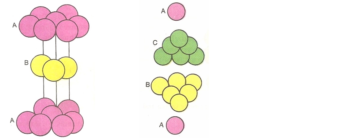When a third layer is to be added, again there are two types of hollows available. One type of hollows marked ‘a’ are unoccupied hollows of the first layer. The other types of hollows are hollows in the second layer marked as ‘c’. Thus, there are two alternatives to build the third layer. These are: