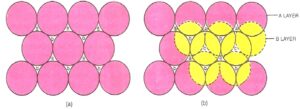 To understand the packing of constituent particles of crystals, let us consider the packing of hard spheres of equal size. The spheres can be arranged side by side touching each other in a row (horizontal alignment). The rows can be combined in the following two ways with respect to the first row to build a crystal plane-