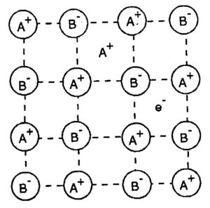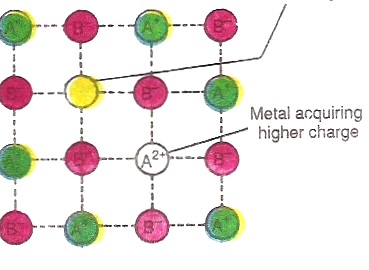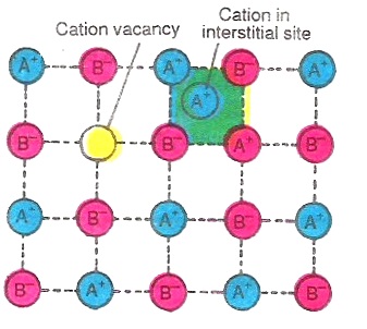 These compounds either contain excess positive or negative ions. However, the crystal as a whole is electrically neutral. If positive charges are in excess, these are balanced by the presence of extra negative charges. As a result, crystal structure becomes irregular and defective. Such defects are called non -stiochiometric defects. These defects are two types and may exist in a crystal in addition to the Schottky and Frenkel defects.