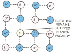 In this case, negative ions may be missing from their lattice sites leaving holes in which the electrons remain entrapped to maintain the electrical neutrality. Evidently, there is an excess of positive (metal) ions although the crystal as a whole is electrically neutral. This type of defect is observed in those crystals which are likely to form Schottky defects. e.g. in alkali metal halides, anion vacancies are produced when alkali metal halide crystals are heated in the atmosphere of the alkali metal vappurs. The metal atoms get deposited on the surface of the alkali metal halide crystal, halide ions move onto the surface and combine with metal atoms. The electrons, thus produced by the ionization of the metal atoms diffuse into the crystal and get trapped at the anion vacancies. The electrons trapped in anion vacancies are referred to as F-centres.