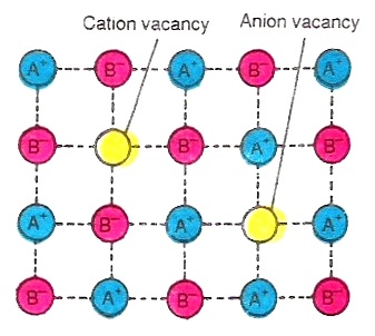 These defects arise in a crystal when cation and anion are missing in equal number from their normal lattice site and as a result, a pair of holes is formed. Because of these holes, there is an increase in the volume of the crystal with no increase in its mass. As a result, the density as well as covalent character of the crystalline solid decreases. Since the number of missing positive ions is equal to the missing negative ions, the crystal as a whole is electrically neutral.