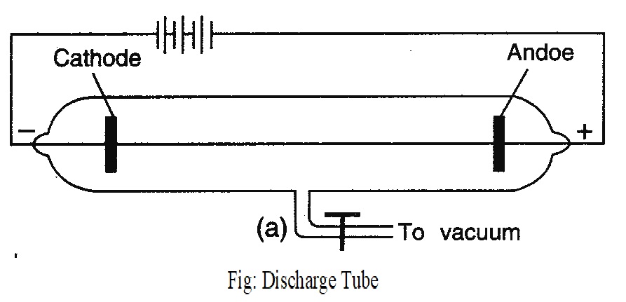 The first of the subatomic particles to be discovered was the Electron (e). The knowledge about the electron was derived as a result of the study of the electric discharge in the discharge tube (J.J. Thomson, 1896). The discharge tube consists of a glass tube with metal electrodes fused in the walls. Through a glass side-arm air can be drawn with a pump. The electrodes are connected to a source of high voltage (10,000 Volts) and the air partially evacuated. The electric discharge passes between the electrodes and the residual gas in the tube begins to glow. If virtually all the gas is evacuated from within the tube, the glow is faintly replaced by faintly luminous ‘rays’ which produce fluorescence on the glass at the end far from the cathode. The rays which proceed from the cathode and move away from it at right angles in straight lines, are called Cathode Rays