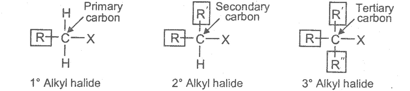 Where, R= alkyl group, X = F, Cl, Br, or I (functional group).The halogen atom bonded to carbon is the functional group of alkyl halides. Alkyl halides are classified as Primary (1◦), Secondary (2•), or Tertiary (3•), depending upon whether the X atom is attached to primary, secondary, or a tertiary carbon.