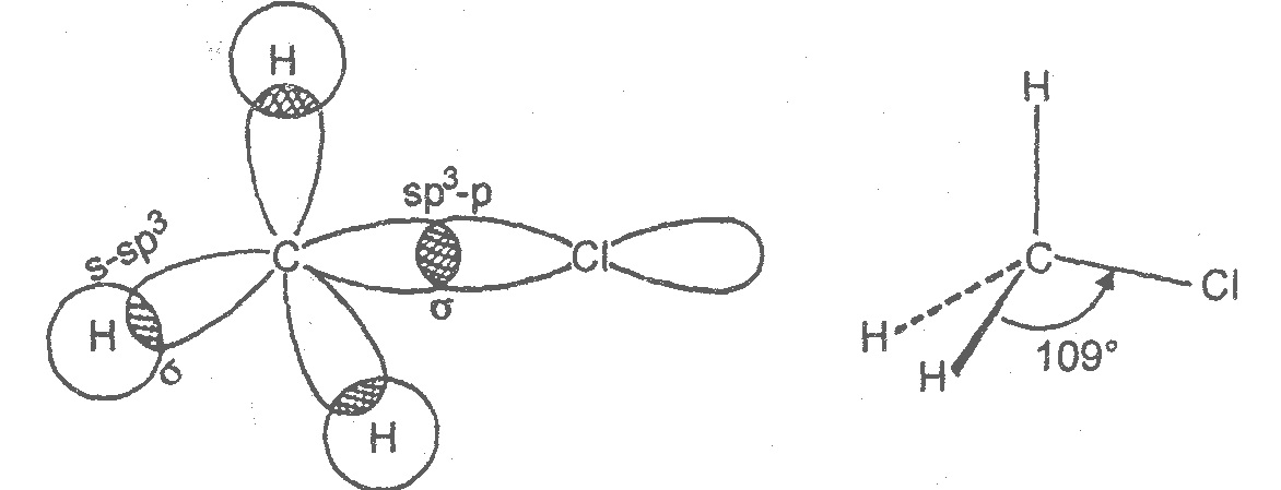 Let us consider methyl chloride (CH3-Cl) for explaining the orbital make up of alkyl halides. In methyl chloride, the carbon atom is sp3 hybridised. The chlorine atom has a half-filled p orbital in its valence shell. The C—Cl bond is formed by the overlap of an sp3 orbital of carbon and the half-filled p orbital of chlorine atom. Each C—H bond is formed by the overlap of an sp3 orbital of carbon and s orbital of hydrogen. All bond are σ-bonds. The bond angle is approximately tetrahedral.