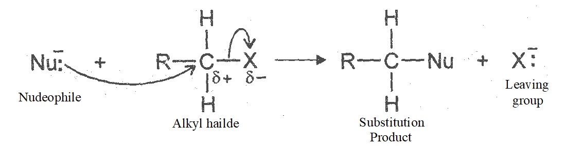 The carbon-halogen bond in alkyl halides is polar because of the high electronegativity of the halogen atom relative to carbon. The carbon atom is therefore a good target for attack by nucleophiles (electron rich species).In fact, the nucleophilic substitution reactions are the most common reactions of alkyl halides. They may be represented as: