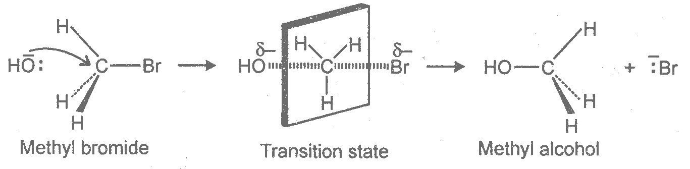 SN2 Mechanism: – SN2 stands for bimolecular nucleophilic substitution. In this mechanism, the attack of the nucleophile and the ejection of the halide ion takes place simultaneously. The reactants on their way to products pass through a transition state where the C—OH bond is half-formed and the C—X bond is half-broken. For example, hydrolysis of methyl bromide by aqueous NaOH. The reaction and the transition state are shown below.