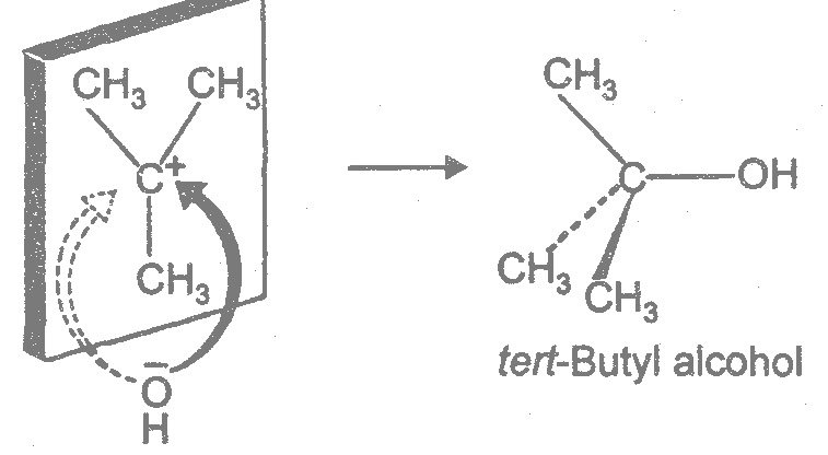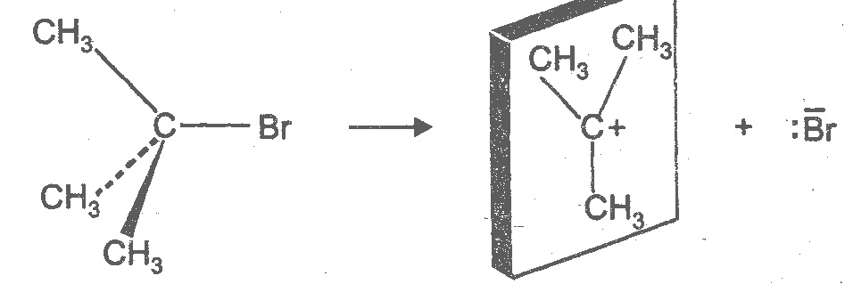 Step-1) The alkyl halide ionises to give a planar carbonium ion. The carbonium ion is planar because the central positively charged carbon atom is sp2 hybridized.