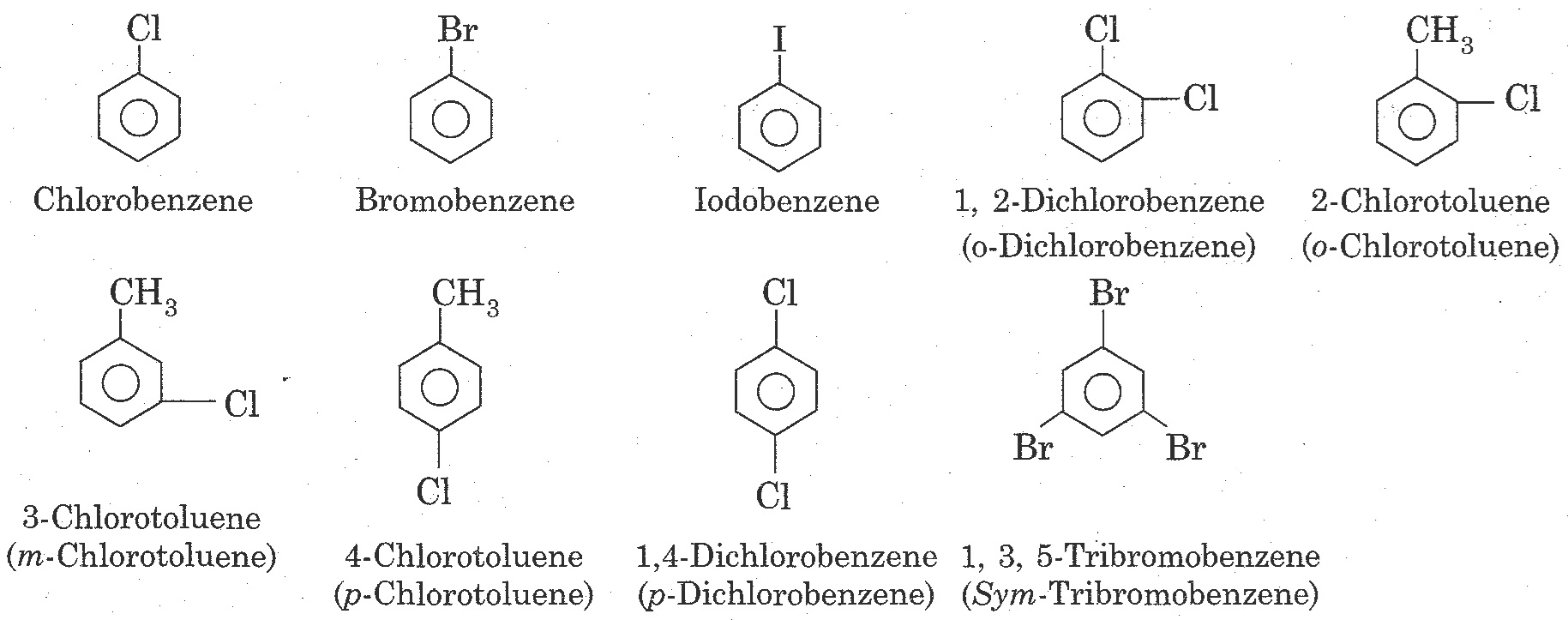 Haloarenes are named by adding the prefix halo (fluoro, chloro, bromo, iodo) before the name of the aromatic hydrocarbon. In case of disubstituted compounds, the relative positions of the substituents 1, 2; 1, 3 and 1, 4 are indicating by the prefixes othro (o), meta (m) and para (p) respectively. e.g.