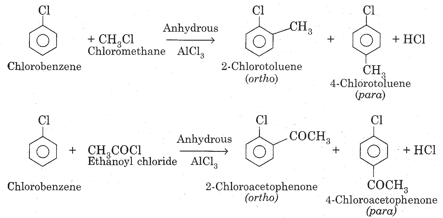 4) Alkylation and acylation:- The reaction, known as Friedel-Craft reaction, is carried out by treating haloarene with alkyl chloride or acyl chloride in the presence of anhydrous aluminium chloride acting as a catalyst. For examples,